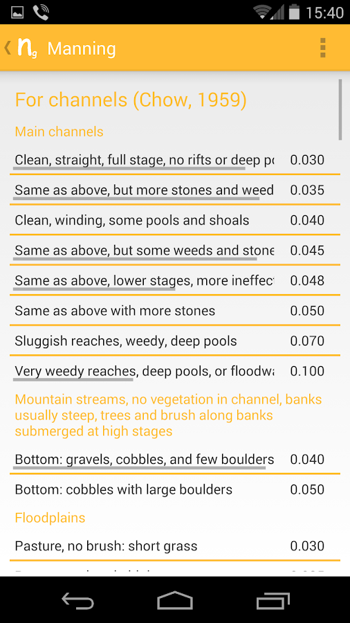 Ademas de brindarte información sobre la base matemática que utiliza para resolver los cálculos, Flow Calculator te informa sobre que valores de rugosidad le corresponderían a los materiales a utilizar en el diseño de tu Canal.